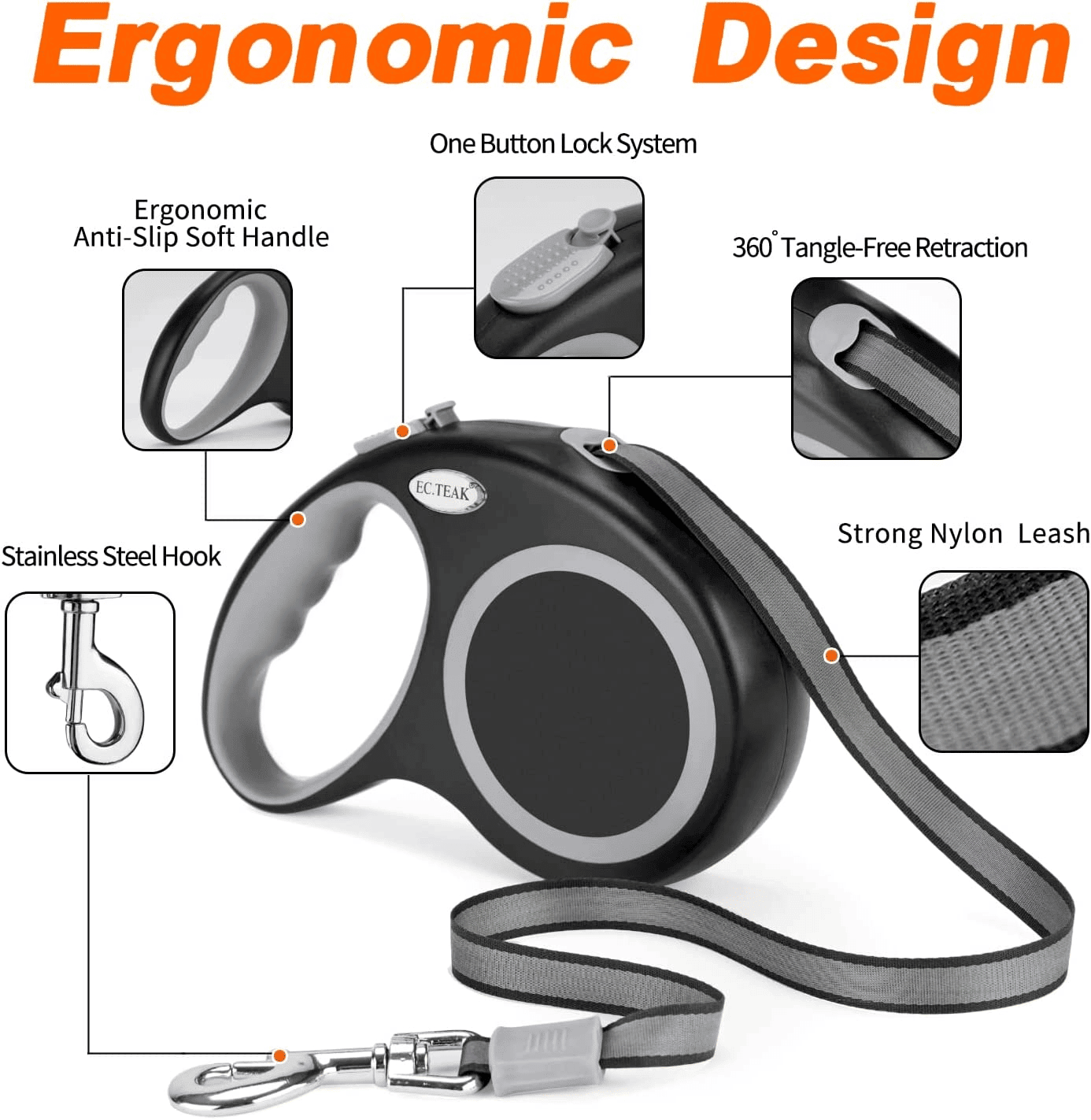 Safe And Reliable Brake System: One Button Break to lock .When the brake button is pushed; the retractable leashes instantly stops and is securely held at exactly that length.a perfect spring for smoothly retracting dog leash while you will not hurt yourself.